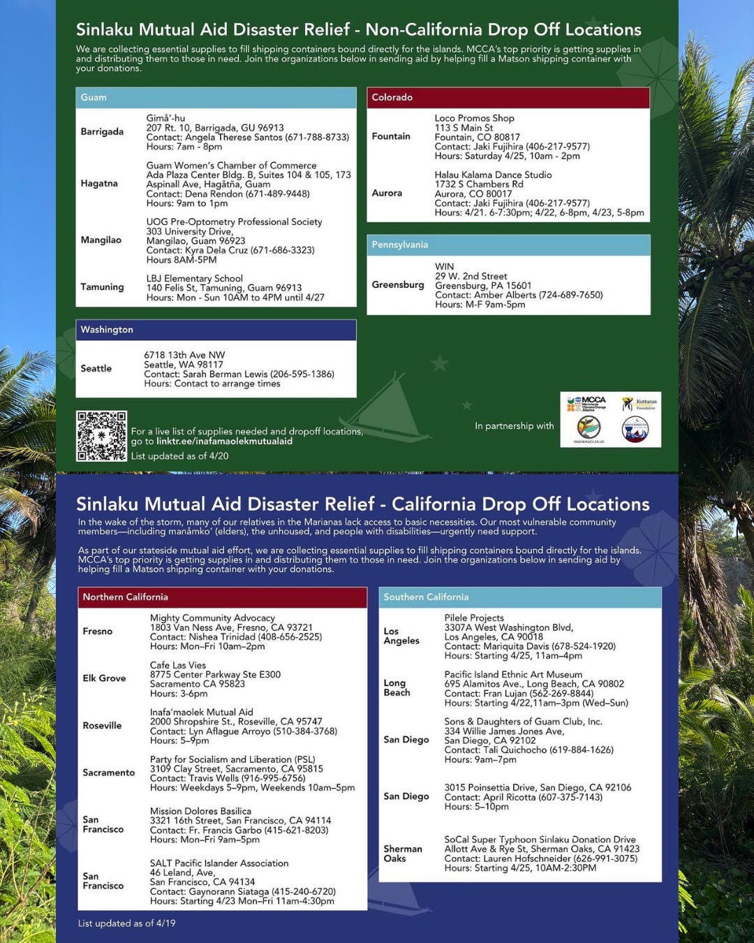 Donate to the following drop-off sites in the U.S. mainland for CNMI and Guam.